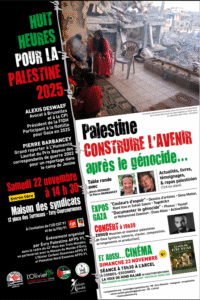Après notre déplacement à Jénine et Hébron en octobre 2025, où nous avons eu des rencontres incroyables et porteuses de projets superbes, nous serions ravis de vous en parler à la maison des syndicats où nous exposerons des dessins des artistes Dena Mattar, Raed Issa et Sohail Salem ! Venez nombreuses et nombreux ! C’est le 22 novembre !